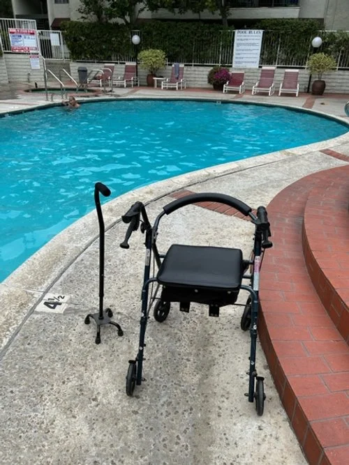Cullinane sometimes uses to avoid falling. The background shows the WF swimming pool where allegedly Ms. Cullinane chased Ms. Lee around.